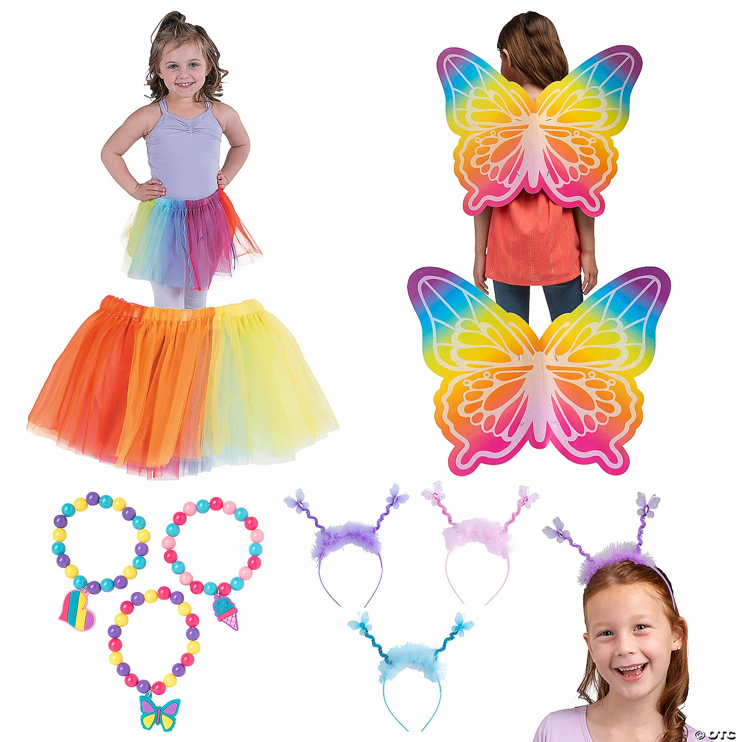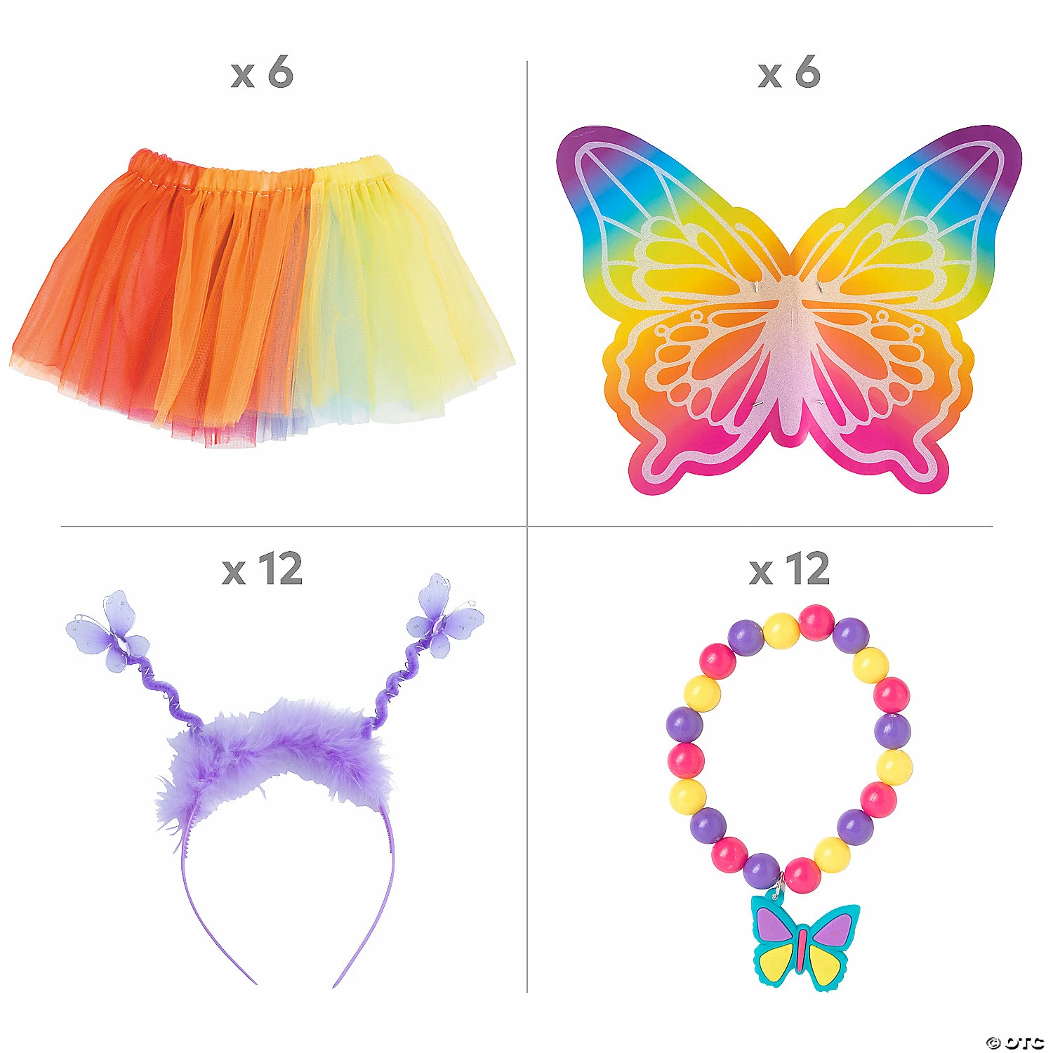 Oh what fun it is to dress up like a beautiful butterfly! This accessories kit is sure to delight little ones as unique birthday party favors, or set this kit out for a birthday party activity to leave your guests fluttering with excitement. This kit also makes a fine addition to your costume accessories for everyday dress-up fun! (36 pcs. per unit) Assortment may vary.Includes:β’ 12 Plastic Butterfly Head Boppers (5″ headband with 1 1/2″ boppers.)β’ 12 Plastic Charm Bead Bracelets (2 1/2″ circ. with 1 1/4″ charm.)β’ 6 Cardstock Rainbow Wings (Includes an elastic cord that stretches to 30″. 24″ x 19″)β’ 6 Polyester Girlβs Rainbow Tutus (9 1/2″ x 20″ circ. Imported.)