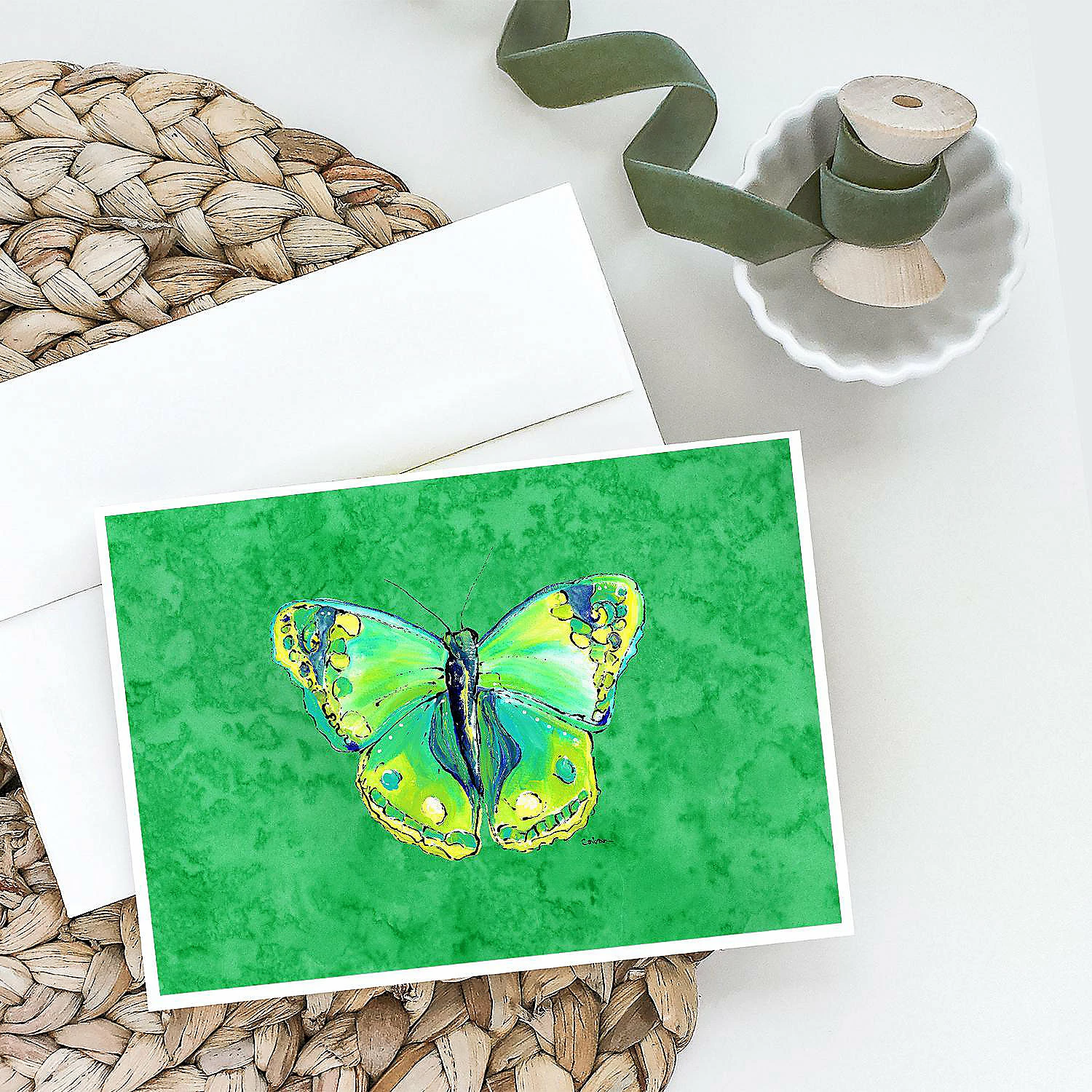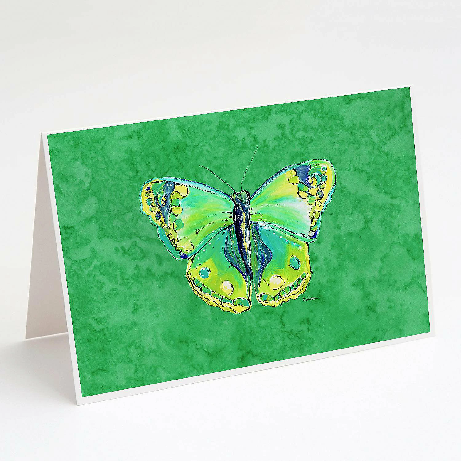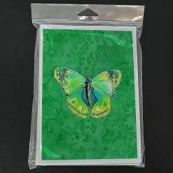 Butterfly Green on Green Greeting Cards and Envelopes Pack of 8. Caroline’s Treasures Printed Greeting card Pack. This is a pack of eight folded 5×7 cards and eight matching white envelopes. These cards are blank inside for you to add your special note or special holiday greeting. The full color artwork cards are printed in our facility in full color on our 80 lb cover stock or 216 GSM. The super smooth finish of the white cards really enhance the artwork on the card. Each card comes with a matching white envelope. The artwork on the card was created by one of our in house creative artist or one of our licensed artists. This is from Caroline’s Treasures Insects category of products.