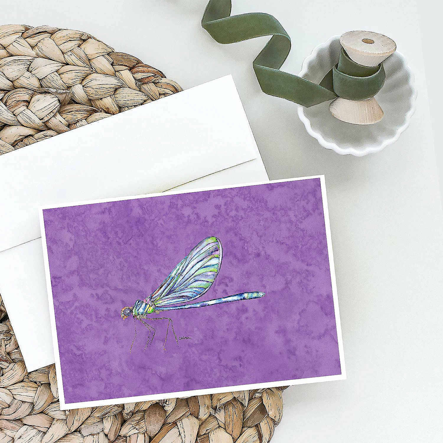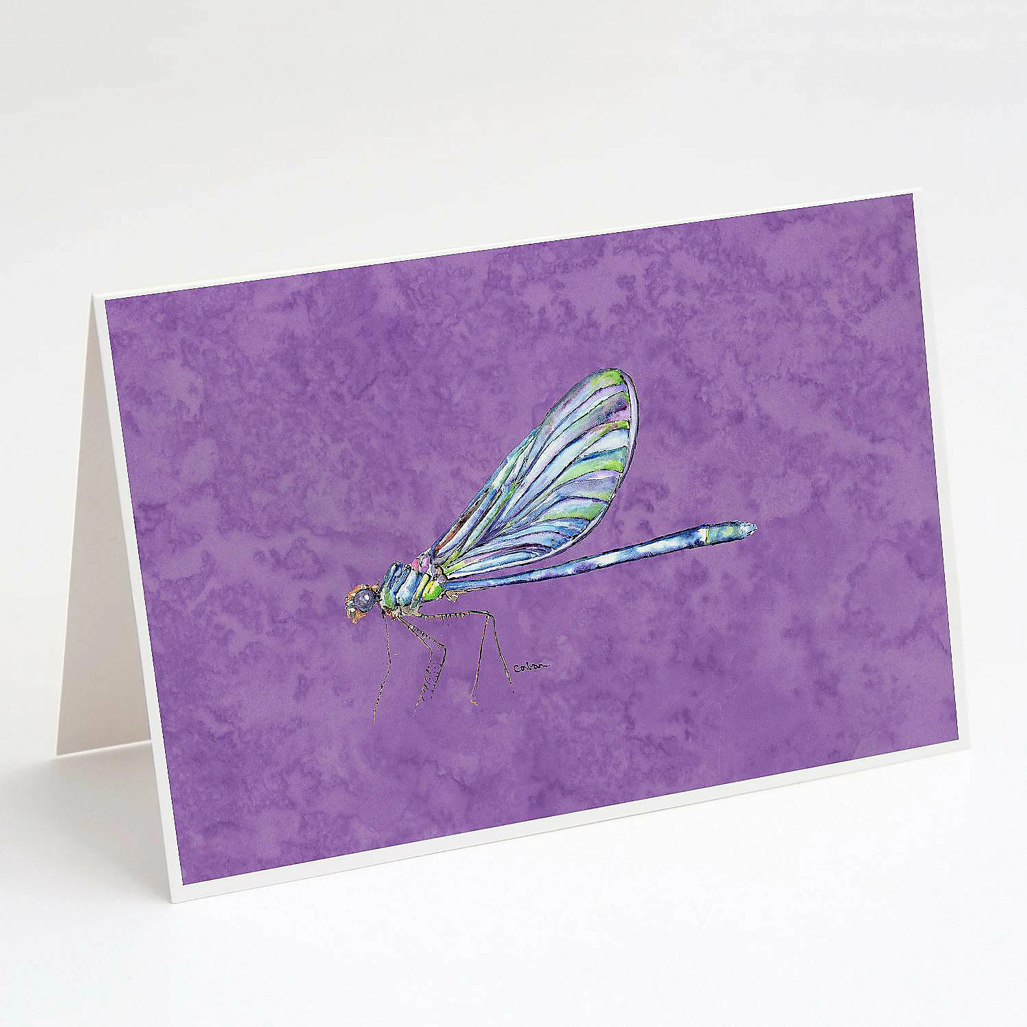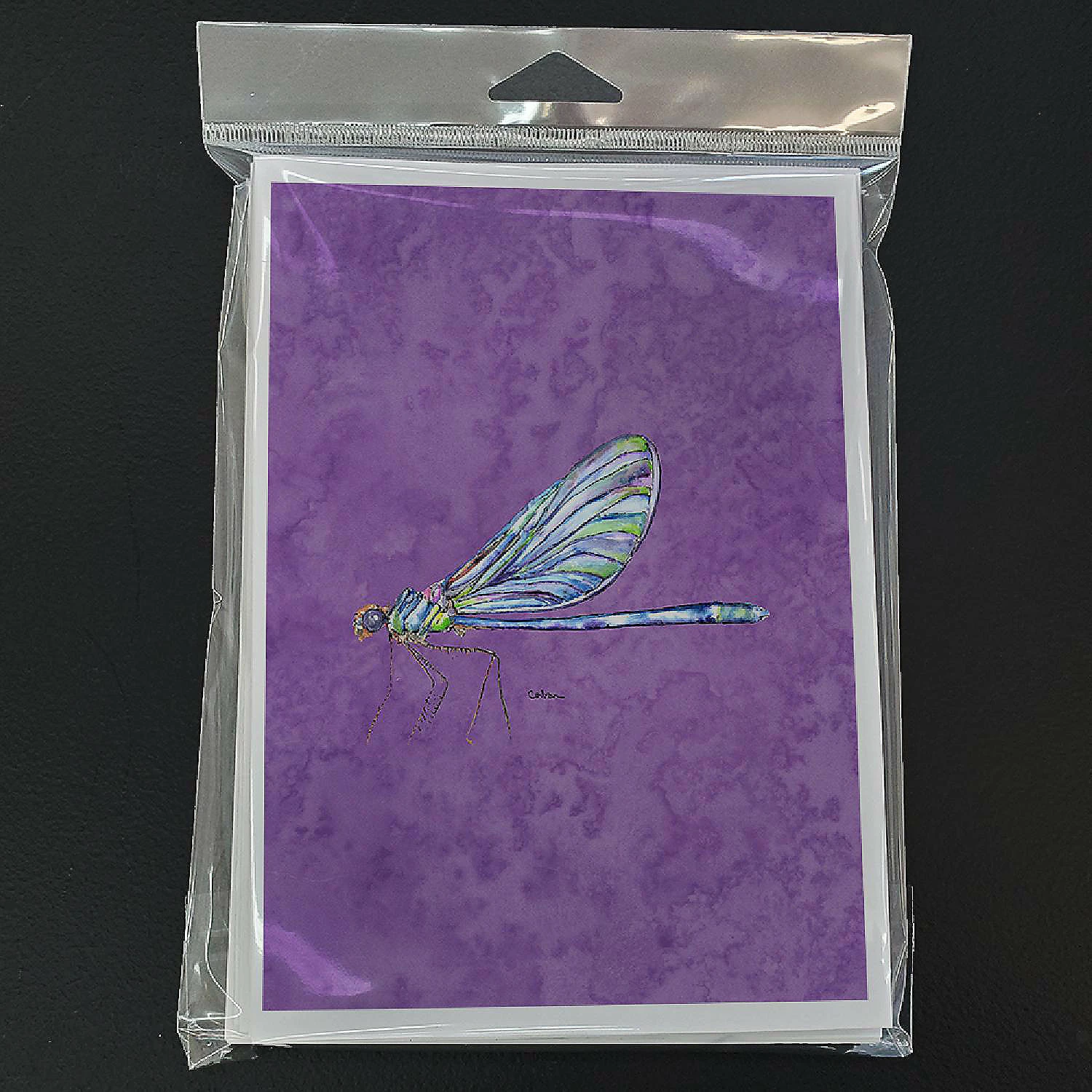 Dragonfly on Purple Greeting Cards and Envelopes Pack of 8. Caroline’s Treasures Printed Greeting card Pack. This is a pack of eight folded 5×7 cards and eight matching white envelopes. These cards are blank inside for you to add your special note or special holiday greeting. The full color artwork cards are printed in our facility in full color on our 80 lb cover stock or 216 GSM. The super smooth finish of the white cards really enhance the artwork on the card. Each card comes with a matching white envelope. The artwork on the card was created by one of our in house creative artist or one of our licensed artists. This is from Caroline’s Treasures Insects category of products.