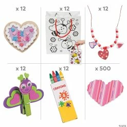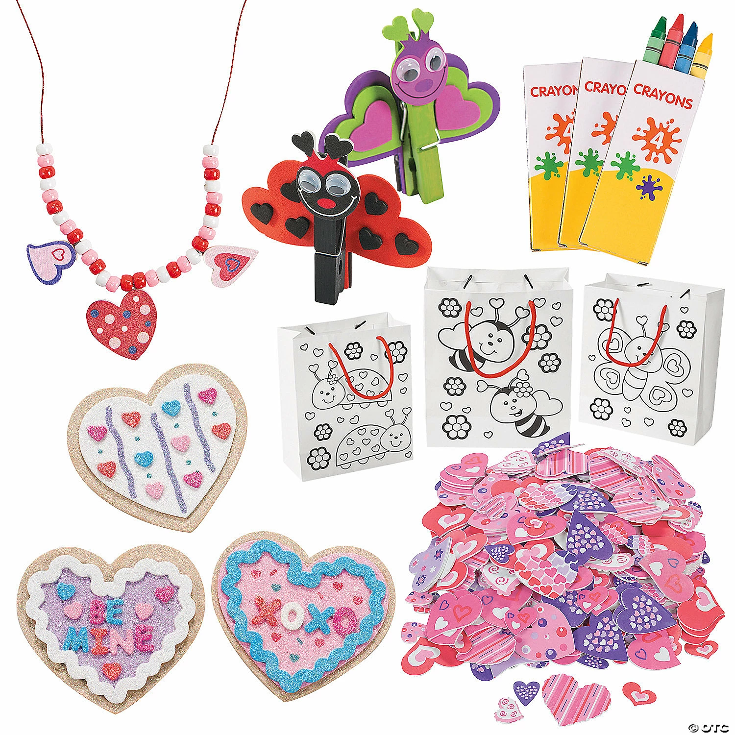 Get ready for some creative Valentineβs Day fun with this kit full of enough heart-y crafts for a dozen craft goody bags! Full of a variety of pre-packaged craft kits, this kit will provide plenty of Valentineβs Day fun in the classroom, at home or at a kidsβ activity table at a Valentineβs Day party. Artistic fun for kids is easier than ever with this fun kit! (144 pcs. per unit) Includes:β’Β 12 Valentine Cookie Magnet Craft Kits (Assorted. Includes self-adhesive pieces and packs of glitter. 3 1/2″) All craft kit pieces are pre-packaged for individual use. Magnets are packaged separately. Do not discard. Kits include instructions. β’ 12 Paper Color Your Own Medium Valentine Love Bug Bags (7 1/2″ x 3 1/2″ x 8 3/4″ with 4″ handles.)β’ 12 Heart Necklace Craft Kits (Includes 1/4″ plastic pony beads and 1 1/8″ – 1 1/2″ painted wood charms on a 27″ plastic-coated cord.) All craft kit pieces are pre-packaged for individual use. Kits include instructions. β’ 12 Love Bug Clothespin Magnet Craft Kits (Includes self-adhesive foam pieces, googly eyes and wooden clothespins. 3-1/4″ x 3-1/2″) All craft kit pieces are pre-packaged for individual use. Magnets are packaged separately. Do not discard. Kits include instructions.β’ 12 4-Color Boxes of Crayons (Safe and non-toxic. 4 assorted crayons per box. 3 1/2″ Conforms to ASTM D-4236.)β’ 500 Foam Valentine Heart Self-Adhesive Shapes (1″ – 2″)β’ Assortments are subject to change at any time and may vary from picture shown. Substituted items will be similar in nature.